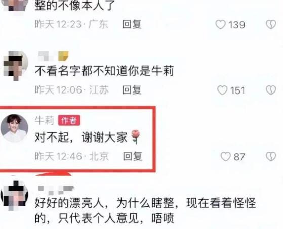 网友们在评论区里为她惋惜,纷纷说都认不出来了。牛莉回复道:对不起,谢谢大家。