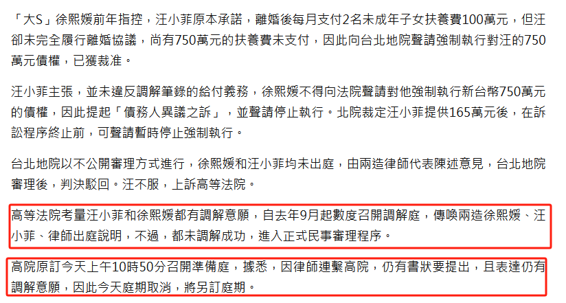 2月1日,据台媒报道,大S与汪小菲在离婚后,因为汪小菲没有履行离婚协议,支付生活费等750万新台币款项,大S在2022年向法院申请强制执行,汪小菲提债务人异议之诉,并且持续上诉。本于今(1日)将对此开召开准备庭,不过因有书状要提出,且双方有调解意愿,因此将另定庭期。