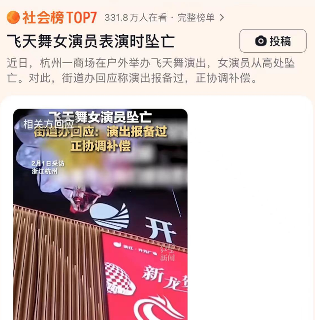 另外有细心网友发现,女演员身上是系着安全绳的,但是她安全绳系在了圈子上,而圈子上面的主绳断了,这才导致她在表演过程中突然从高空跌落,狠狠摔了下来。
