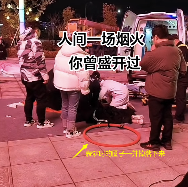 当时女演员被一群人团团围住,救护车抵达现场后,救援人员争分夺秒的对其进行急救,跟随其一起掉落的铁圈也被搁置到路边。