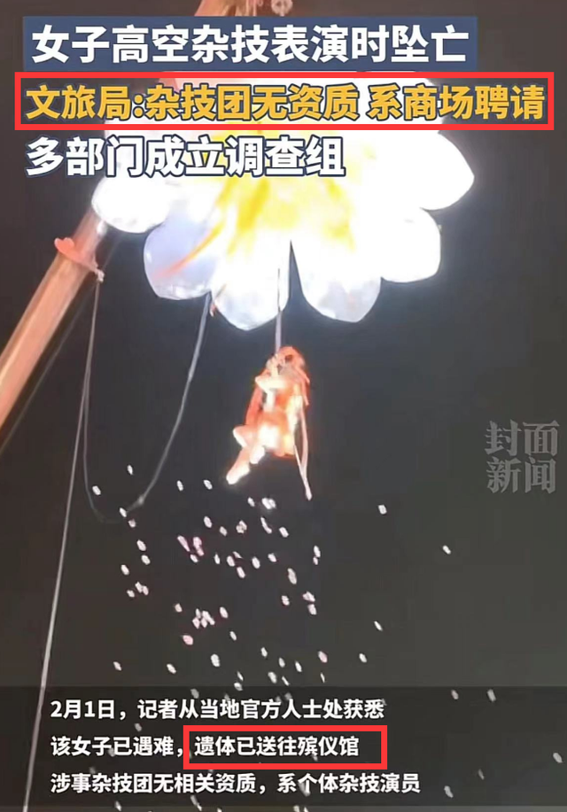 据悉,在女演员确认坠亡之后,其遗体随即被送往殡仪馆,根据最新调查结果得知,涉事的杂技团并无相关资质,里面的演员也都是个体杂技演员,商场聘请了无资质的杂技团进行表演,势必也有不可推卸的责任。