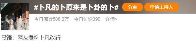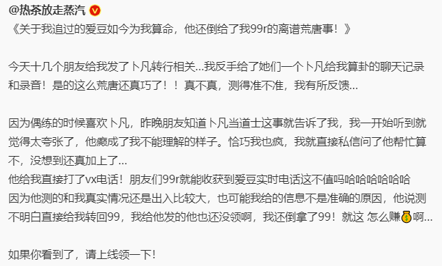有粉丝爆料称自己曾经找卜凡算命,不仅没给钱,还倒赚了他99⬇️