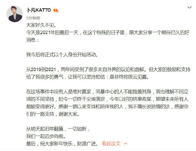 卜凡表示公司的业务安排影响了他的学业,退团是为了完成学业⬇️