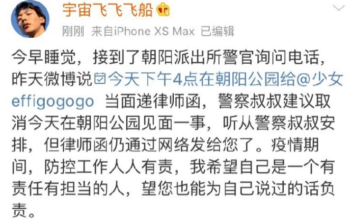 这一架到底是没约上,不仅因为当时正值口罩期间,还因为他接到了朝阳警方的致电问候⬇️
