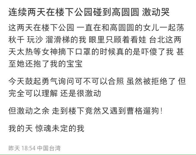 一位来自台湾省的博主于2月20日晚间发文,透露偶遇高圆圆母女的画面,称这两天一直都在楼下和高圆圆的女儿荡秋千、玩沙、滑滑梯等。