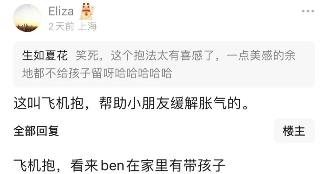 这个抱小孩的手法看着挺喜感,其实是专业的“飞机抱”,可以帮小朋友缓解胀气。