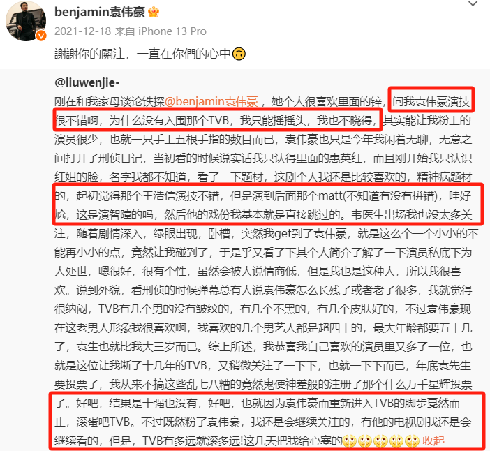 在这条博文里,有对评选结果的质疑、有对他同事王浩信的吐槽、还有对他老东家TVB的漫骂……⬇️