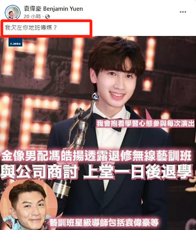 金像奖最佳男配角得主冯皓扬在TVB艺员训练班上了一天课就退班了,这事本来跟袁伟豪没关系。