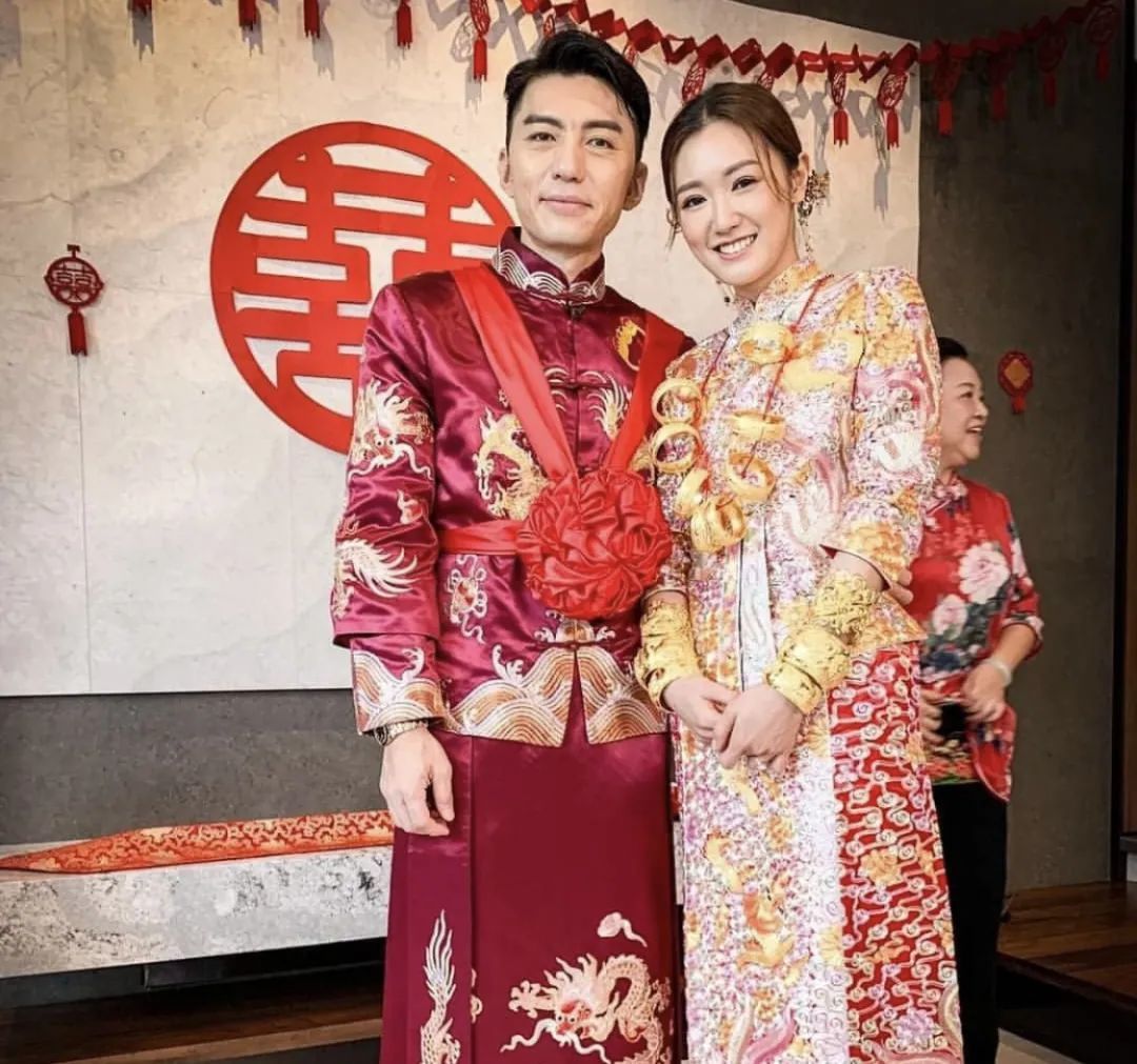 晒出的中式结婚照中,张宝儿手上戴3对、脖子上挂了4对龙凤金镯⬇️
