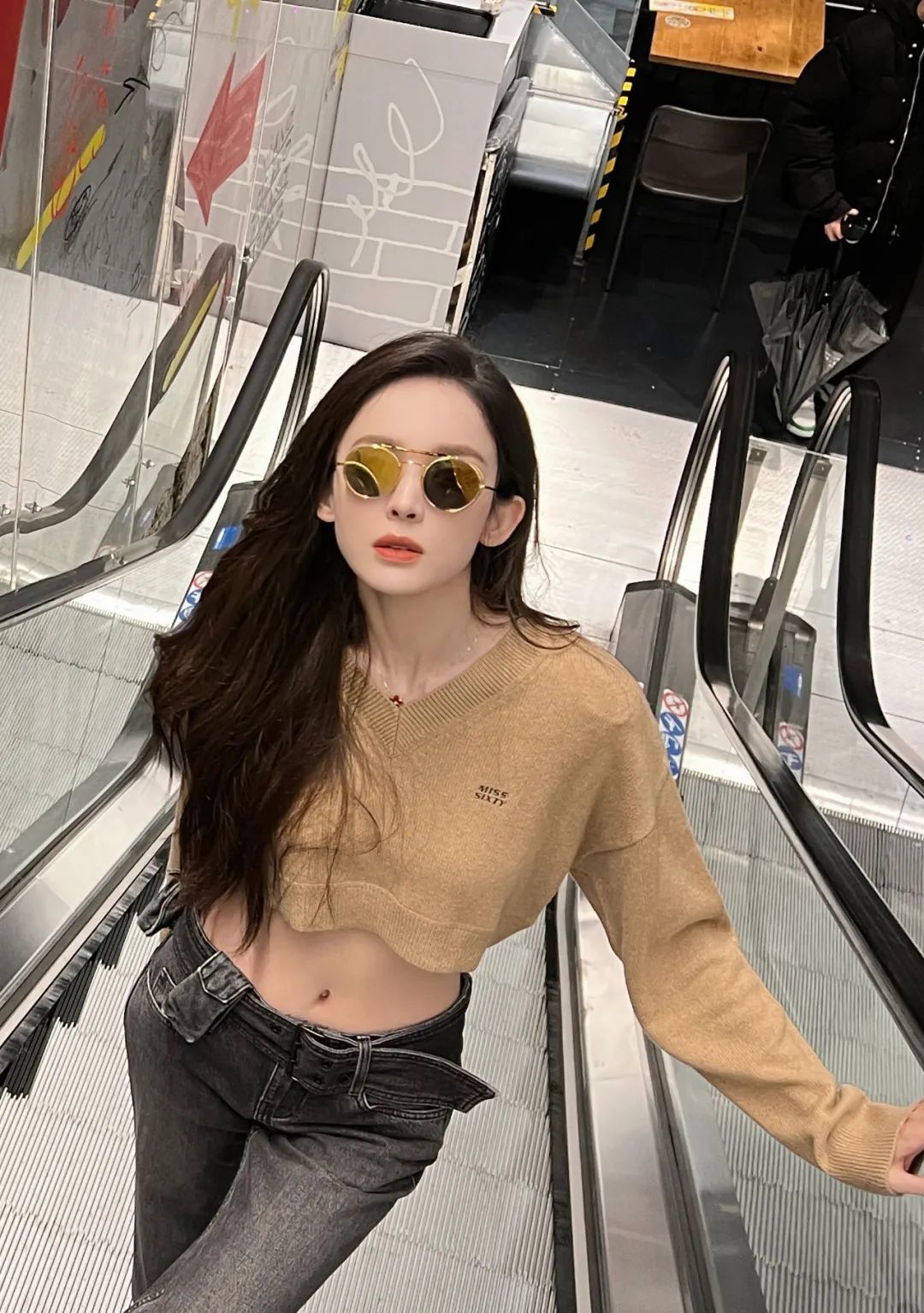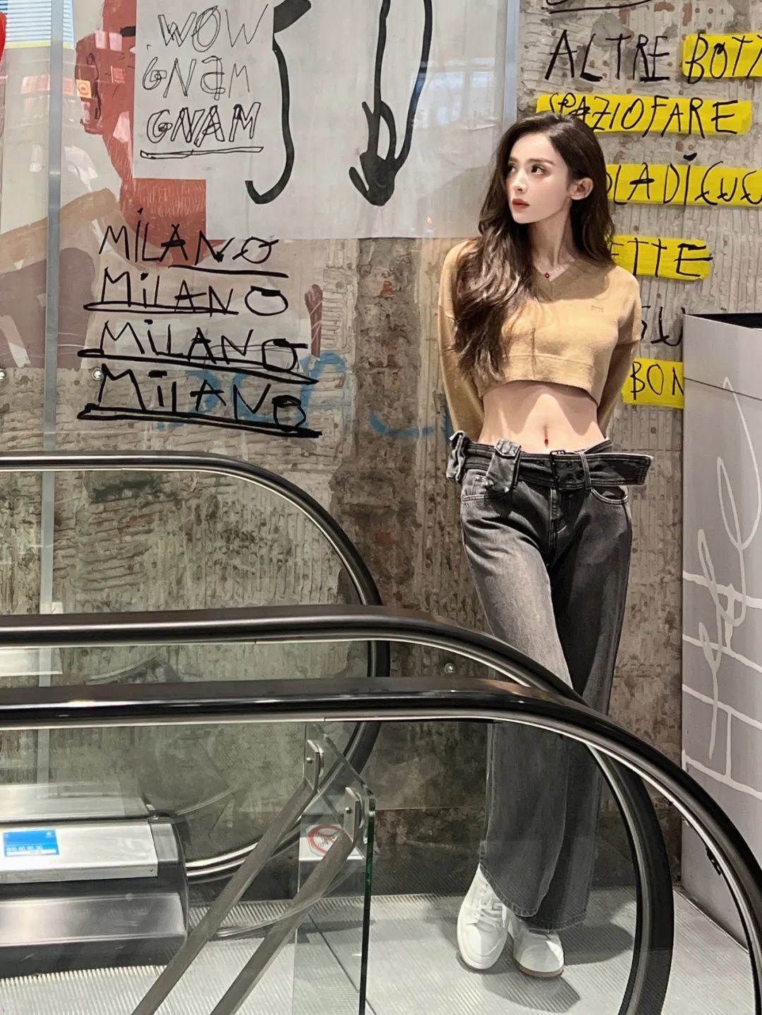 古力娜扎的这套穿搭非常舒适随性,卡其色短款露脐V领针织衫,下身搭配深灰色牛仔裤,牛仔裤的腰部设计也很有新意。▼