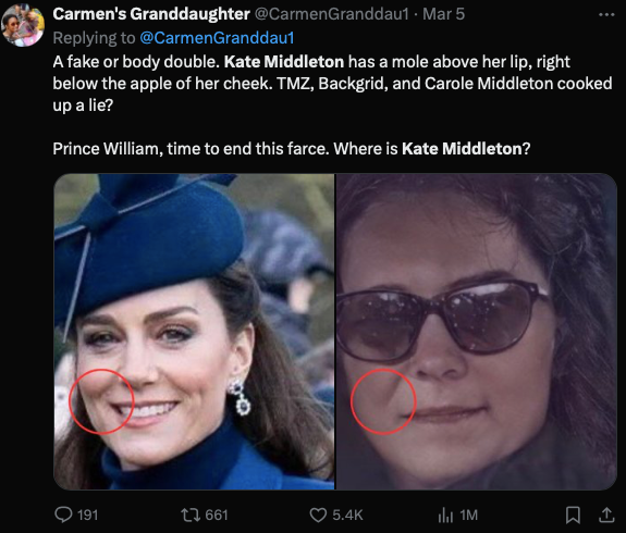 “这绝对是假货或者替身,大家注意看,凯特的右唇上方是有一个色素痣的,就在她的苹果肌下方。威廉王子,麻烦出面终结这场闹剧,告诉我们凯特到底去哪里了?”