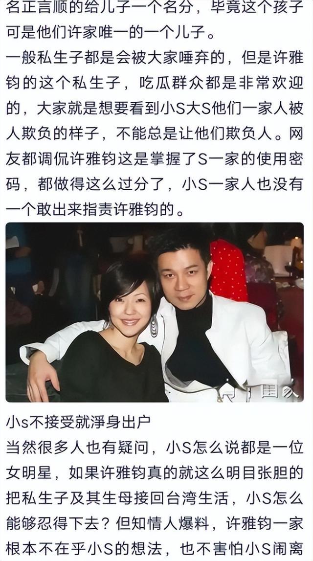 针对私生子问题,许雅钧本人尚未对此作出回应,然而,传闻在娱乐圈中传播甚广,引发了公众的广泛关注。这一事件不仅牵扯到了许雅钧本人,还牵涉到了与他有关系的其他人,包括大S和小S等娱乐圈的知名人士。