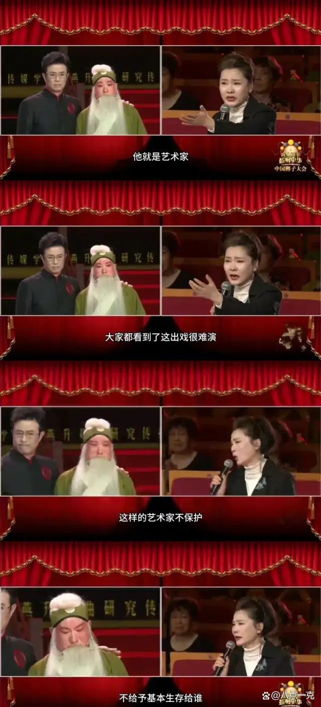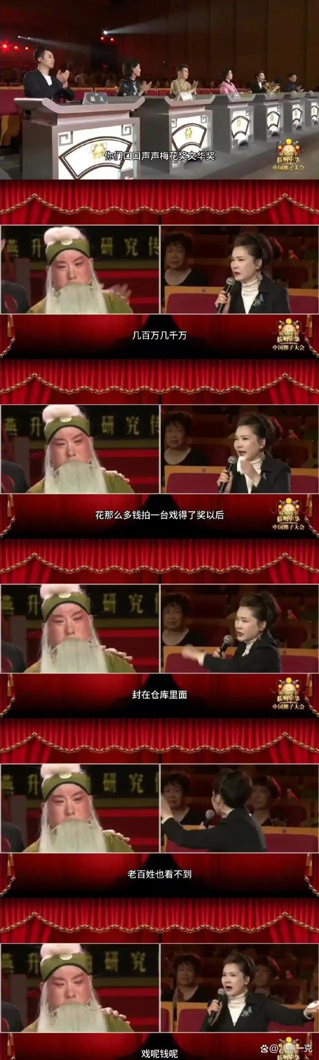 何赛飞激动得一度声音哽咽,你们口口声声梅花奖、文华奖,几百万几千万花那么多钱排一台戏,得了奖之后封到仓库里,老百姓也看不到,戏呢?钱呢?到哪里去了?