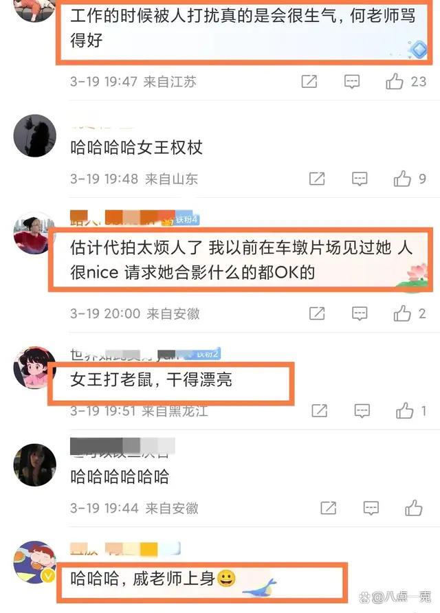 在何赛飞的怒斥和追赶下,代拍被吓得一路逃窜,对此很多网友纷纷留言表示,工作的时候被人打扰真的会很生气,女王打老鼠,干得漂亮。估计也是代拍太烦了,以前在片场见过本人,人很好很nice。