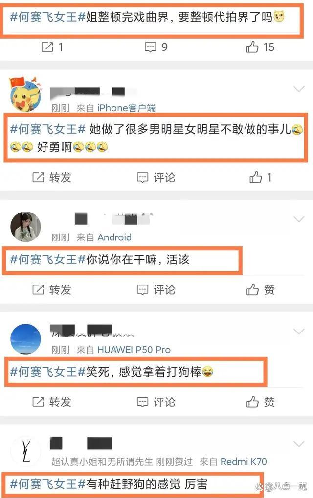 不久后“何赛飞女王”的相关词条也冲上了高位热搜,对此很多网友纷纷留言表示,姐整顿完戏曲界,又要整顿代拍界了,有种在搞野狗的感觉。做了好多明星想做又不敢做的事情,真的好勇敢啊。