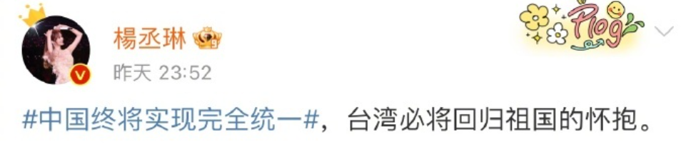 而像杨丞琳和王心凌虽然姗姗来迟,但最后还是转发了“支持祖国统一”的言论,得到了很多网友们的称赞。