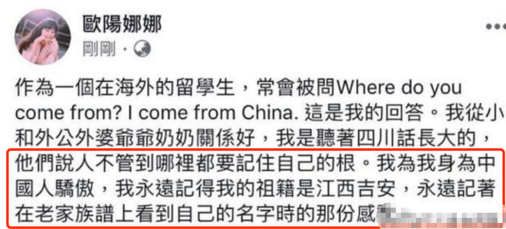 欧阳娜娜虽然年轻,但她的“爱国之心”早就表明,不仅多次公开表示自己的中国人,还曾带妈妈回祖籍江西吉安“寻根”,跪拜在祖宗牌位面前。
