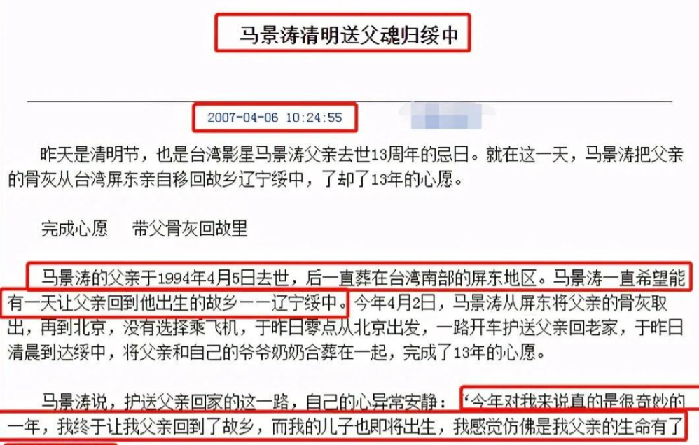 在2007年的时候,马景涛就把父亲的骨灰从台湾省带回了老家辽宁,和自己的爷爷奶奶合葬在一起。