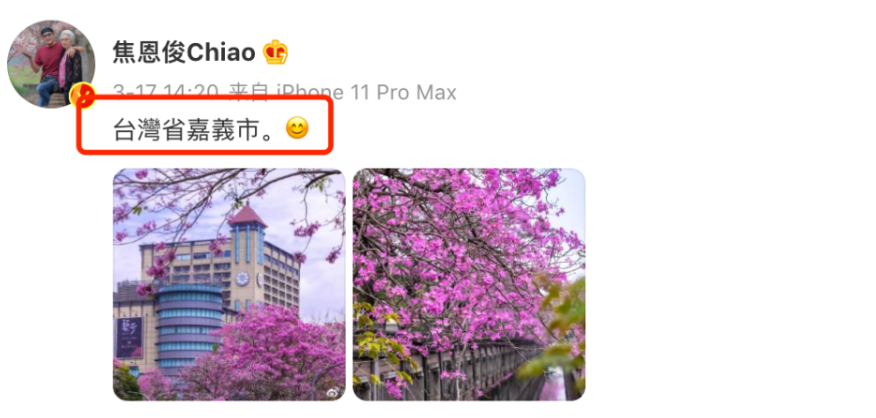 他在社交平台发的所有动态,都会把台湾称呼为“台湾省”。