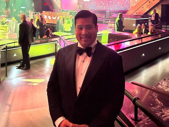 缎面戗驳领礼服上身,搭配一丝不苟的油头,还是蛮有王子派头的~