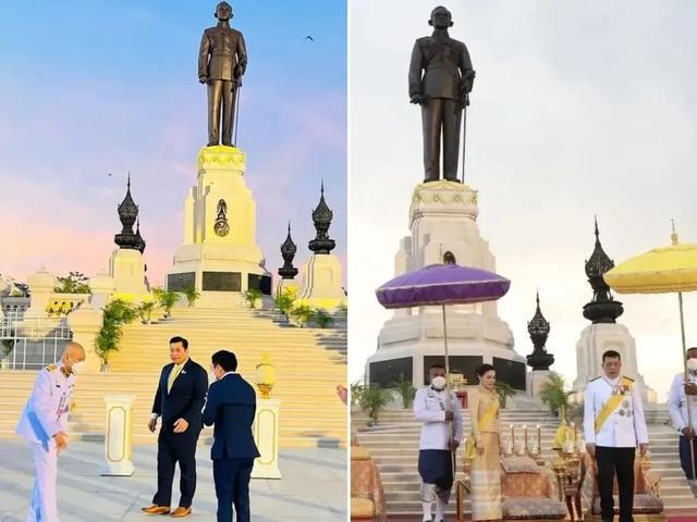 还动不动就发文缅怀德高望重的已故老泰王,这次更是把拳拳孝心落在了行动上,掐准点在爷爷生日期间回国,不但祭拜流程和王室一模一样(左图能看到有官方人员在旁守候),就连献花地点也和泰王撞上了,一前一后刚好错开时间。如此巧合不禁让人怀疑,难道是老父亲“父爱发现”、默许首肯了?