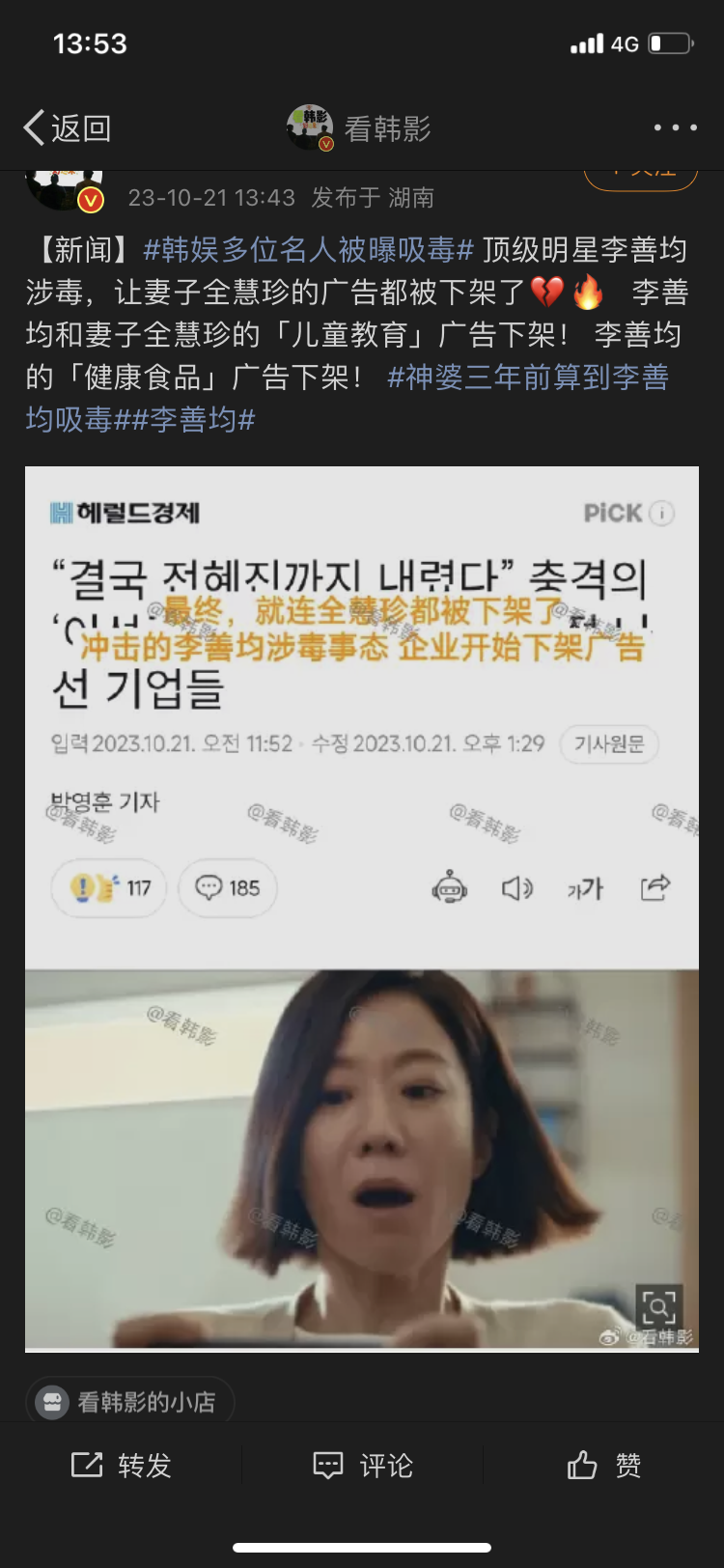 涉毒丑闻曝光后,李善均和全慧珍合拍的广告,下架了⬇️