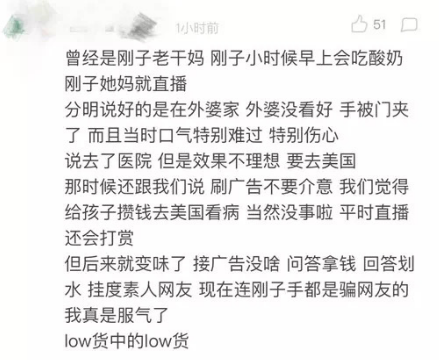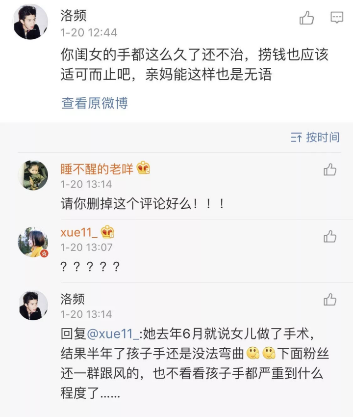 还针对其中一条说她“利用女儿捞钱”的评论,