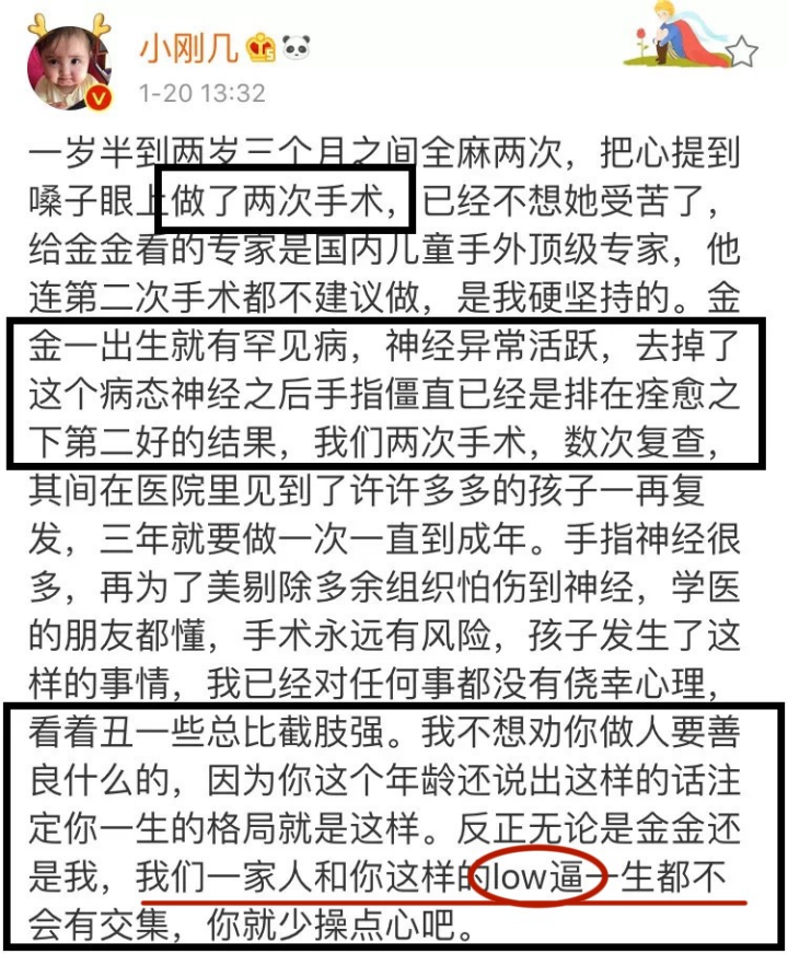 事情始于小刚几的妈妈塔塔发的这样一条微博: