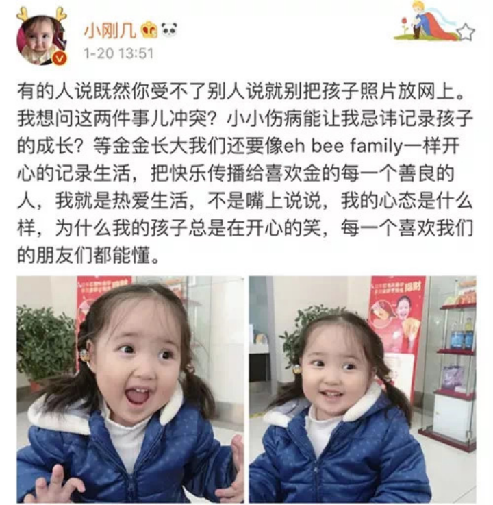 她还发了一条微博说:自己就是热爱生活,想发孩子照片记录她的成长,但不能接受网上有人说自己的孩子。