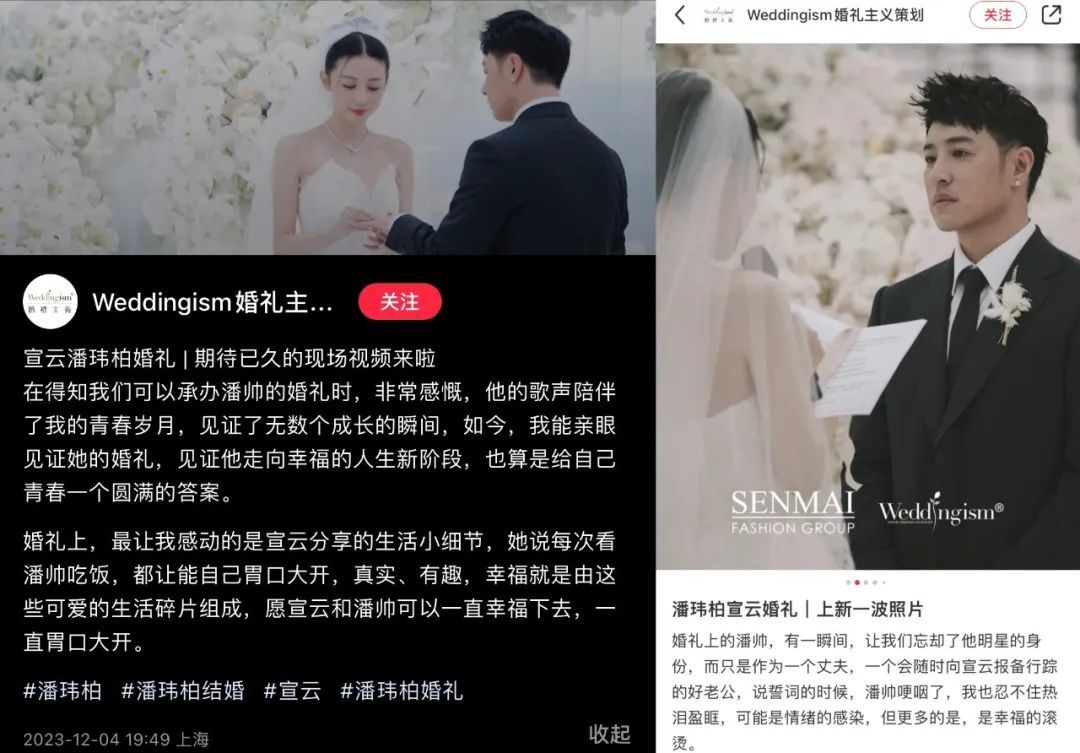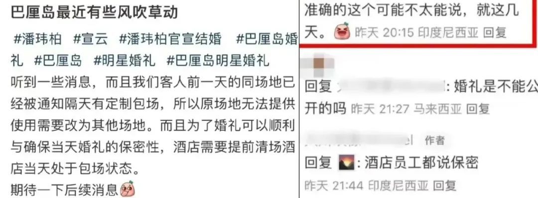 ▲ 有婚庆公司的摄影师率先在某书发文,表示自家客人想预定的场地被人大手笔包场了,虽然再三强调“准确时间不太能说”,“酒店员工都说保密”,但由于带上了潘玮柏和宣云两人的照片和各种“#”,此事立马上了热搜,变成了人尽皆知的“秘密”。