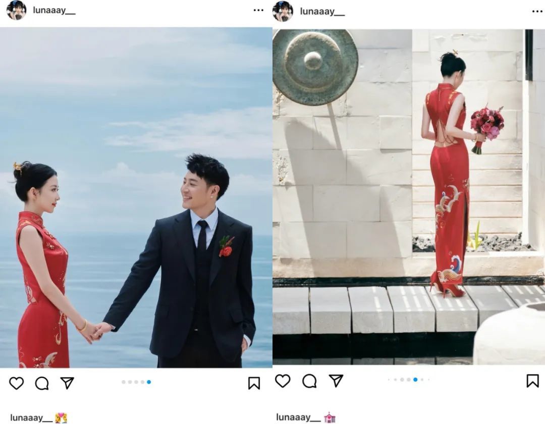 ▲ 传统红色旗袍来自Nora Reve定制的中式嫁衣“纤凝玉月”,正是以她的英文名Luna为创作灵感。
