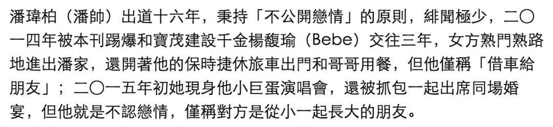 ▲ 至于杨馥瑜(Bebe),除了2014年被周刊拍到疑似同居,她还开着潘玮柏的保时捷休旅车出门外,两人的社交平台也留存着各种同款细节图,但对于恋情,双方始终抵死不认,仅以“朋友”相称。