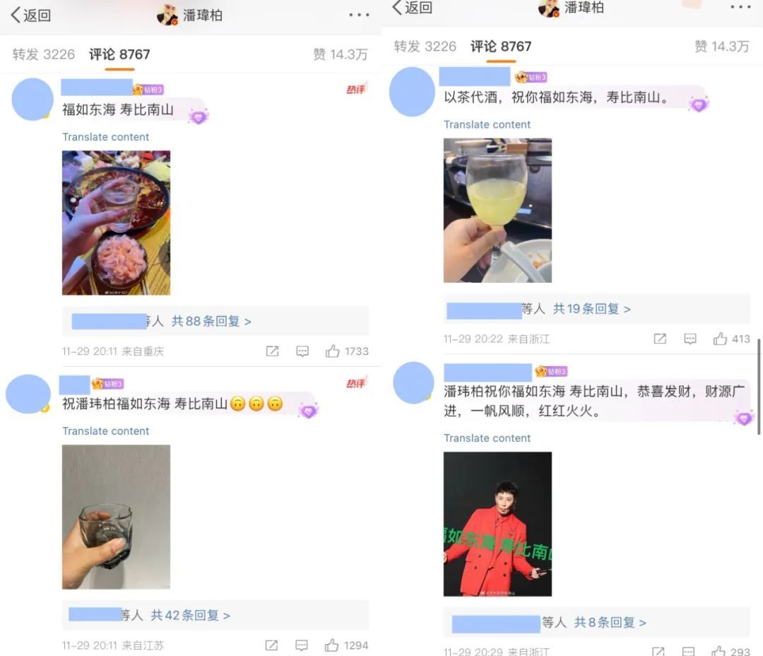 颇为搞笑的是这条微博下方的评论区,一水的“福如东海,寿比南山”,一度让人怀疑走错片场,这是新婚微博该有的评论区吗?要知道潘玮柏的生日可是在8月。