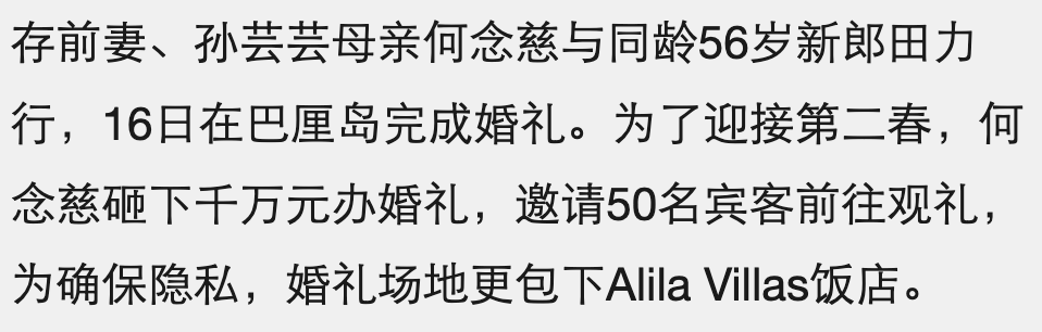 也正因为这样,这里从很早以前开始就被各路名流明星们相中。像是2010年,孙芸芸的妈妈何念慈改嫁田力行的婚礼就在这儿举行,当时为了保护隐私,豪掷千金,包下了整间酒店。