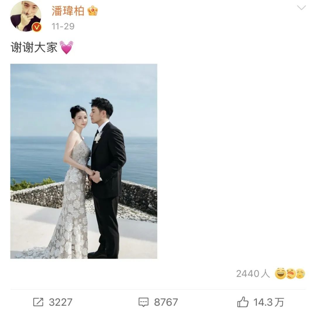 果然,11月29日当晚,潘玮柏在微博发了婚礼上的合照,简单配文“谢谢大家”: