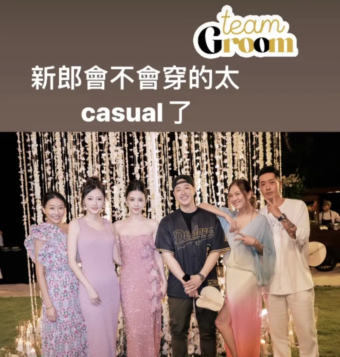 ▲ 婚前派对,新娘郑重其事,穿着Valentino,而潘玮柏的穿搭实在是有够休闲,连朋友都忍不住吐槽。