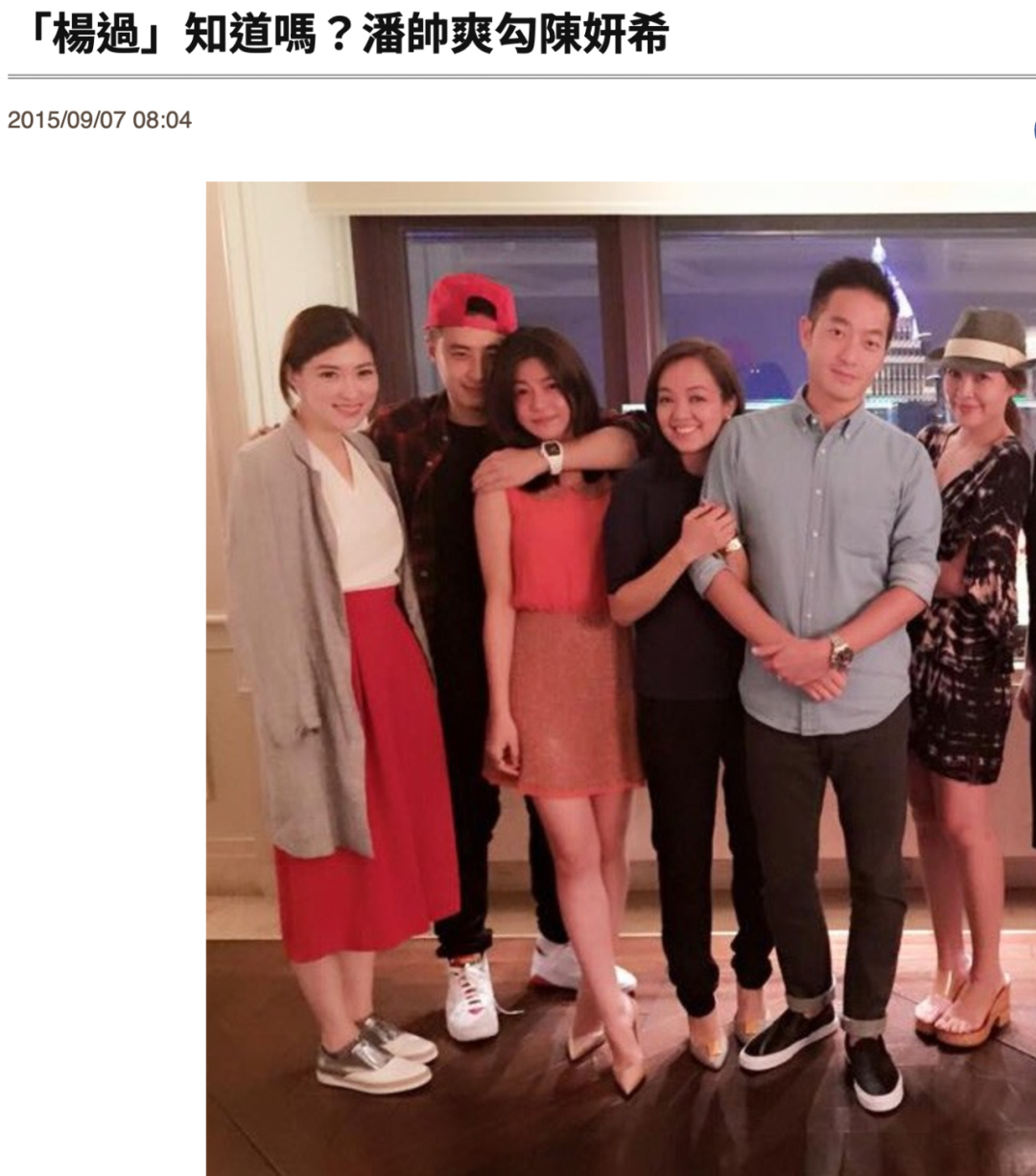 ▲ 2015年,陈妍希认爱陈晓后不久流出一张她跟潘玮柏一同参加友人生日聚会的合照,照片里潘玮柏勾着陈妍希的脖子相当熟稔和亲密,在当下惹出了一阵新闻。