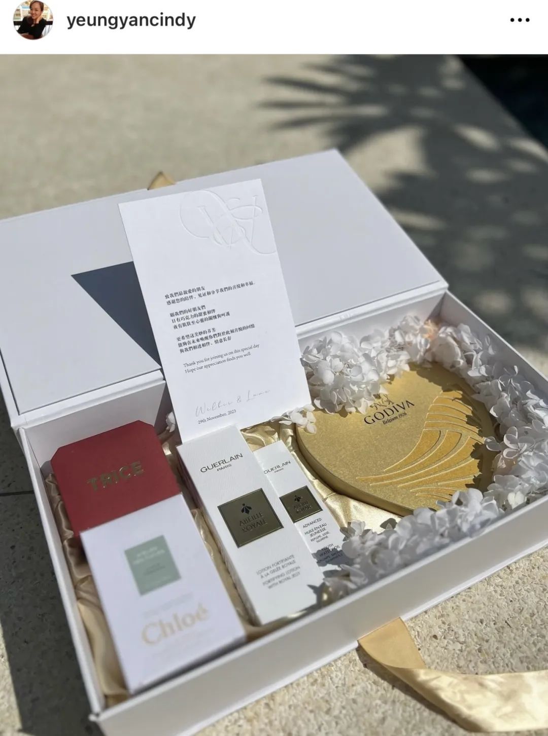 ▲ 伴手礼包括Trice定制的微笑项链,Chloe的仙境花园香氛,Godiva的巧克力,娇兰的水和复原蜜。宣云特别在某书更新了条vlog,就是为了把上述品牌名字重新念一遍,类似于“特别鸣谢”。