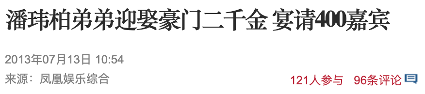 待到2013年7月,潘玮柏的弟弟潘玮楷迎娶“太子汽车二千金”许婷婷时,虽然也席开了40桌,但阵仗搞得格外低调,坚决拒绝媒体采访拍摄,对外说是“非娱乐圈人士,不想受访”,可外界认为这是在杜绝员工闹事的可能性,避免重蹈姐姐婚礼的覆辙。