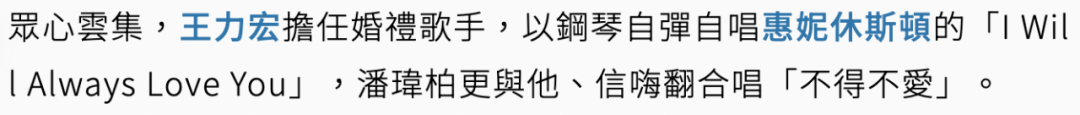 王力宏跟潘玮柏是多年老友了,根据网上流传的视频,他在婚礼现场自弹自唱了阿黛尔的《Make You Feel My Love》,据说还有惠特妮·休斯顿的《I Will Always Love You 》: