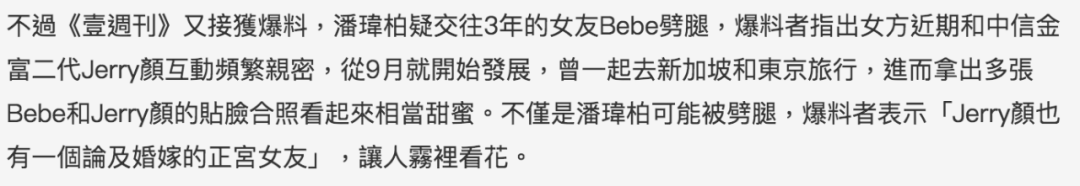 时间来到2017年底,周刊收到爆料,认为杨馥瑜(Bebe)劈腿了中信金控颜文隆的儿子颜志宇,因此甩了潘玮柏: