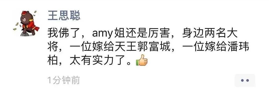 关于Amy姐到底是何方神圣的这段,我们在当初潘玮柏官宣结婚时写的长文里详细聊过,虽然文章已删,但这里并不打算重新展开赘述,毕竟如今再回头看,因为王思聪的一句话就给女生加了一个巨大的标签,这件事本身并不太合适。
