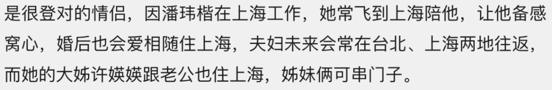 也是在美国,潘玮楷经友人介绍认识了许婷婷,两人很快坠入爱河。因为潘玮楷在上海任职的关系,许婷婷很长一段时间都要两地来回跑。