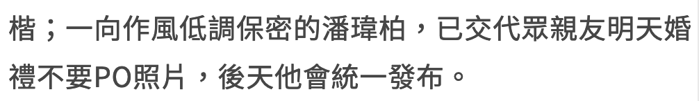 说了这么多,回到此次潘玮柏的婚礼。按媒体爆料的,现场来宾们被要求不得擅自发布照片,直到婚礼结束第二天由新人们率先统一发布。