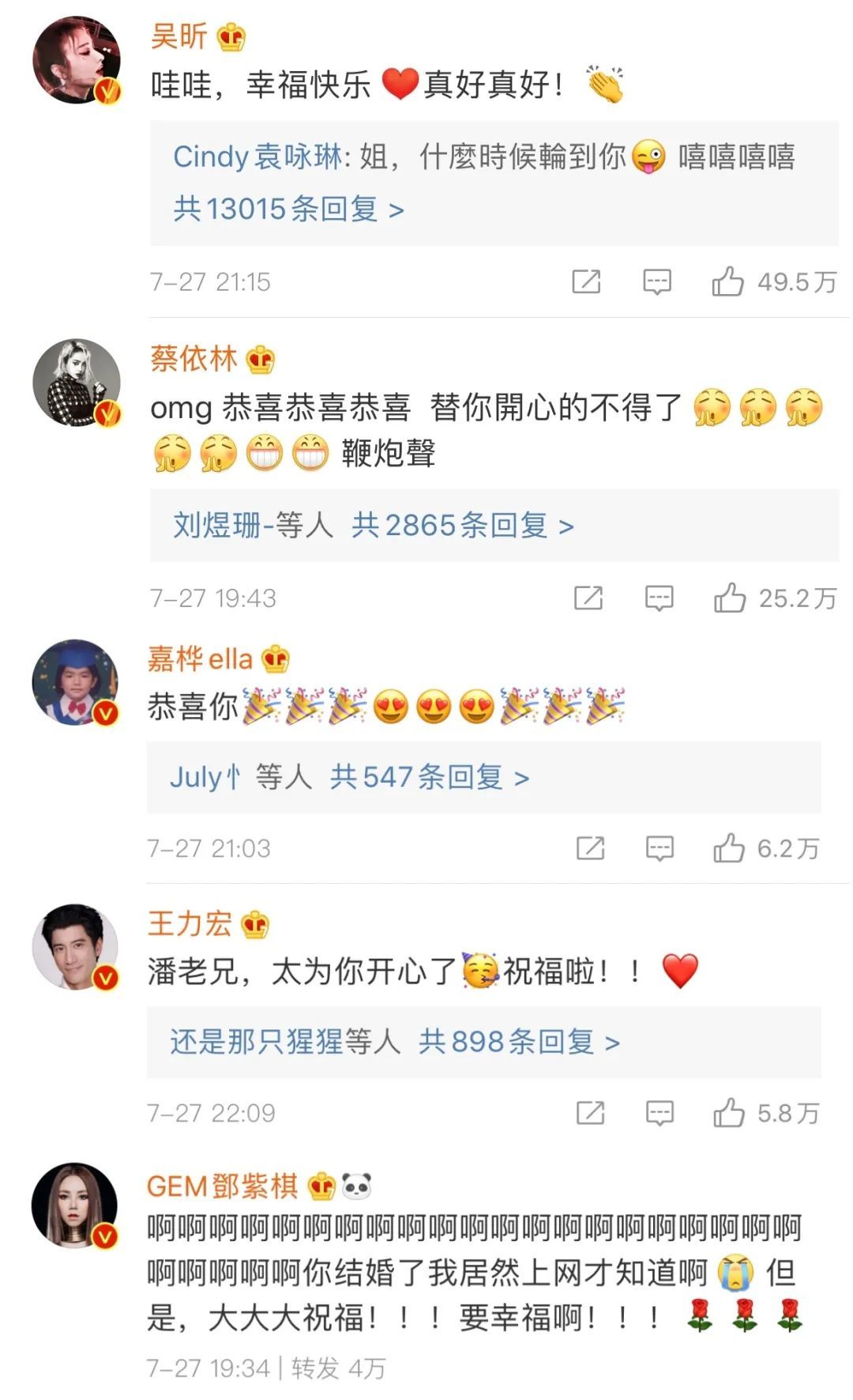▲ 这则官宣消息发出后,收获了众多明星的留言祝福。