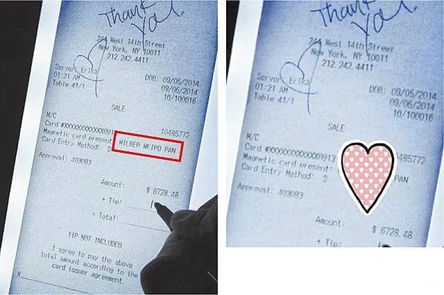 ▲ 台媒认为2014年左右,潘玮柏就已经跟杨馥瑜(Bebe)同居了,但同年9月,“七朵花”成员赖薇如却在ins上晒出潘玮柏在纽约酒吧为其买单的签单照片,价格贵达6728.48美金。她先是po出了图左,被眼尖的网友发现了潘玮柏的名字后又欲盖弥彰地拿心形贴纸遮盖(图右),引发哗然后才将图片彻底删除,可此时,绯闻已经传得甚嚣尘上。