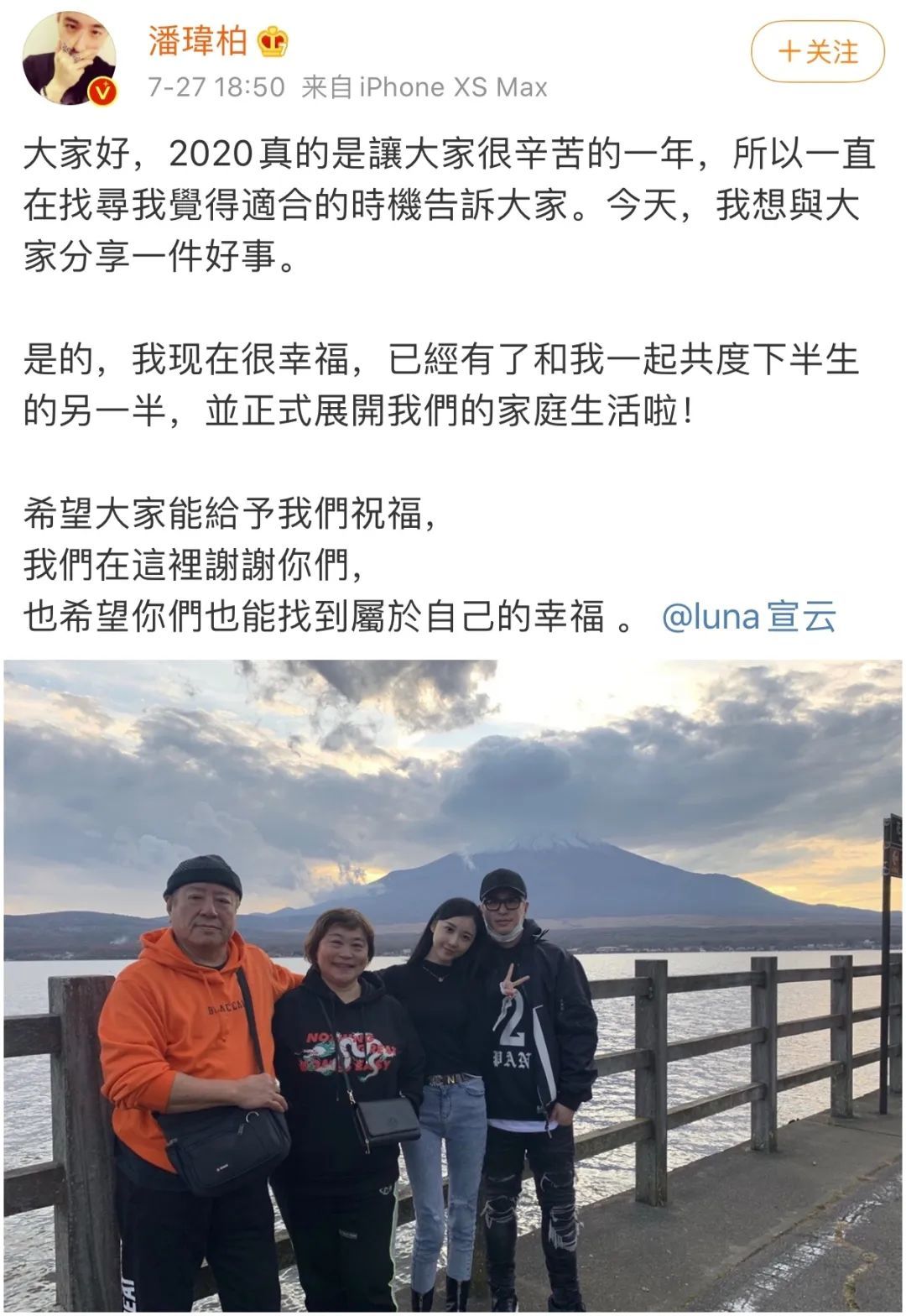 ▲ 2020年7月27日,在娱乐圈摸爬滚打近20年却从未主动公开过恋情的潘玮柏,在社交媒体发文宣布人生进入新阶段,既@了另一半,又晒出了两人和父母同游的合照,俨然是甜蜜幸福的一家人。