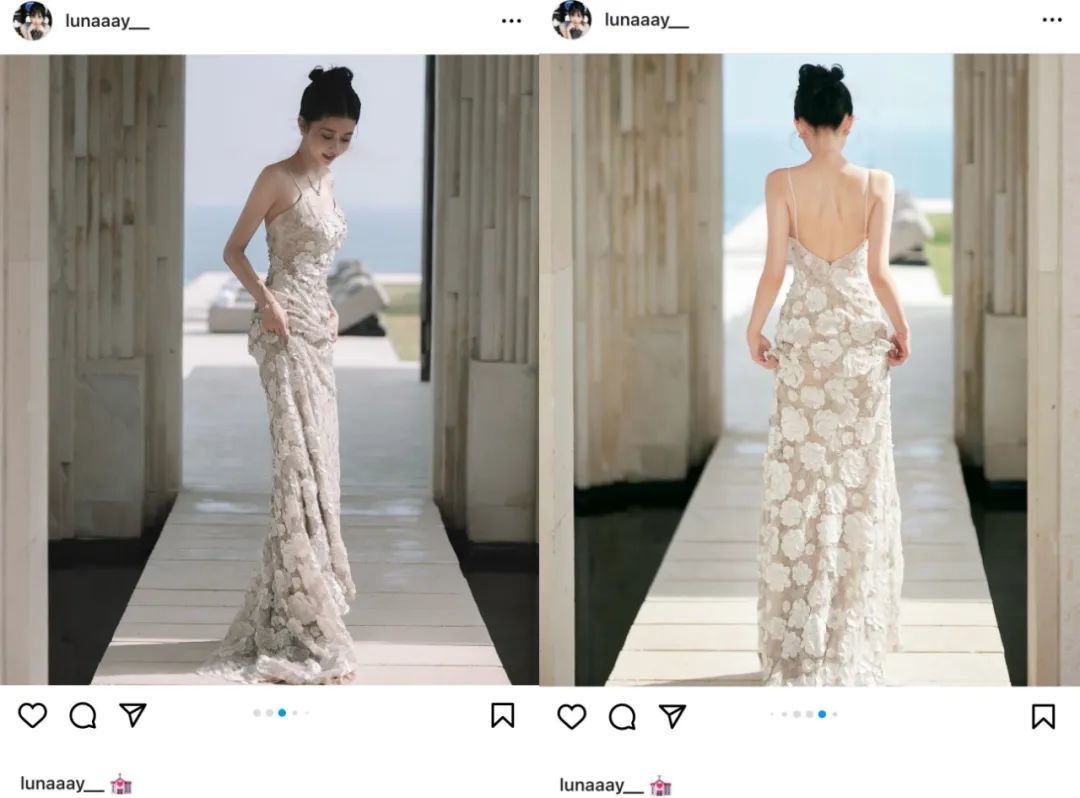 ▲ 看起来廖晓乔的身材还处在产后恢复阶段。上图是宣云自有品牌Veloura发的图,下图是当天婚礼的摄影团队发的,下图明显没P……