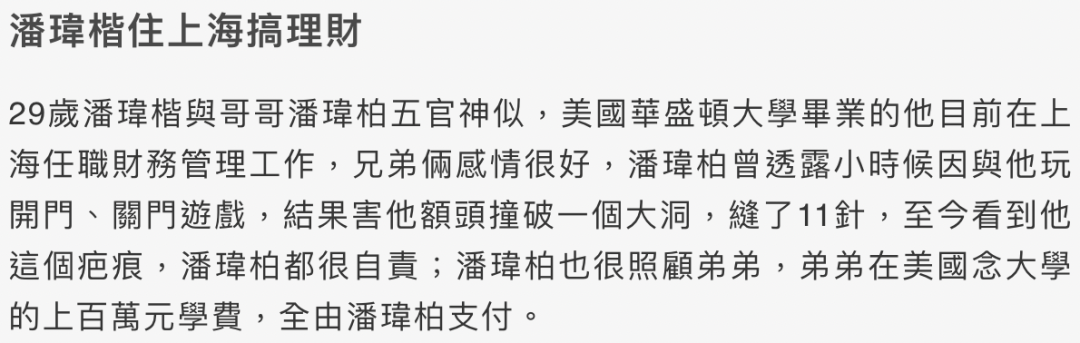 都说潘玮柏和弟弟潘玮楷五官神似,兄弟俩感情很好,弟弟上美国华盛顿大学的学费都是哥哥帮忙负担的。