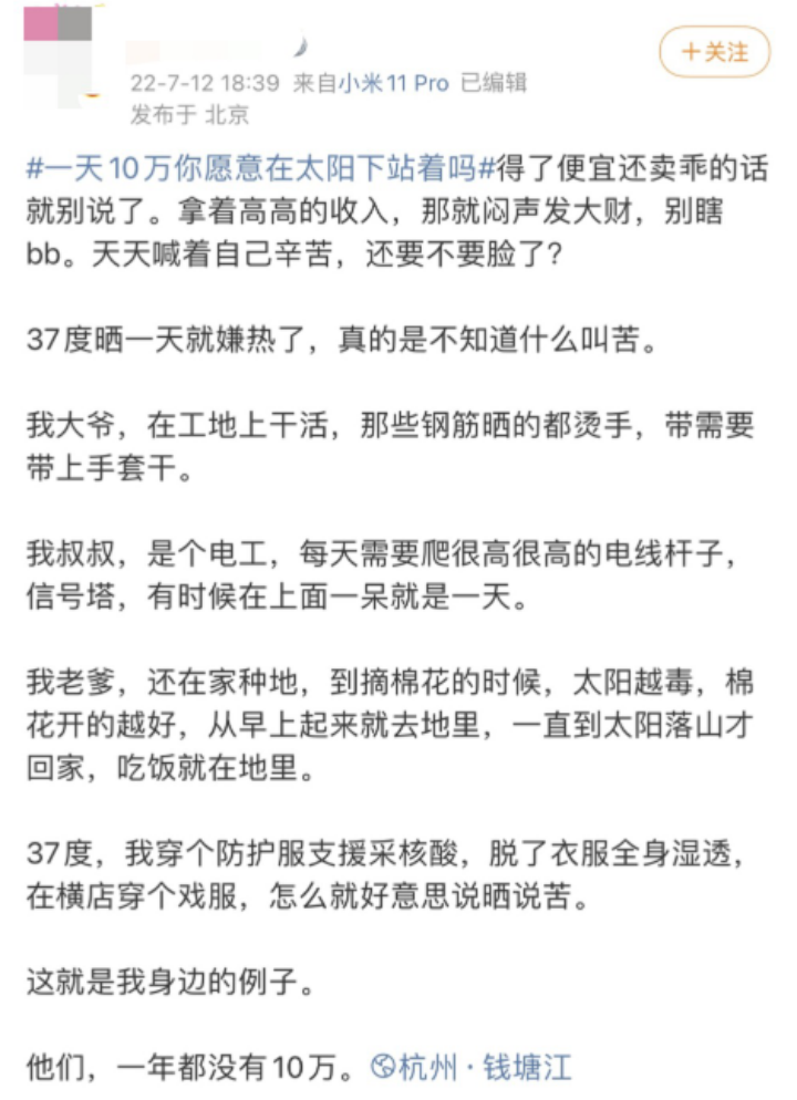 “太阳底下站一天”本意是想诉说演员辛苦,赚钱不易。